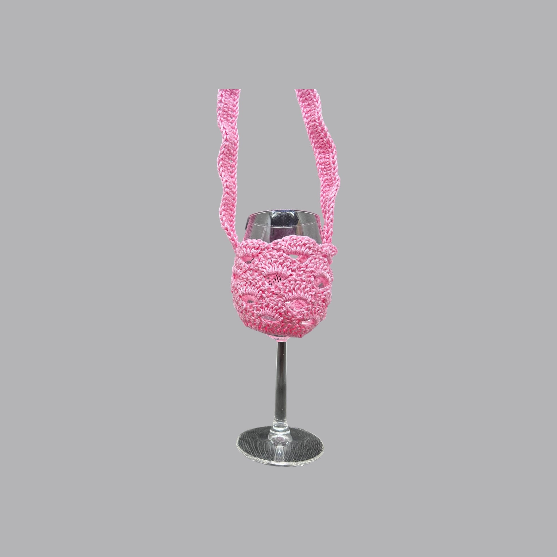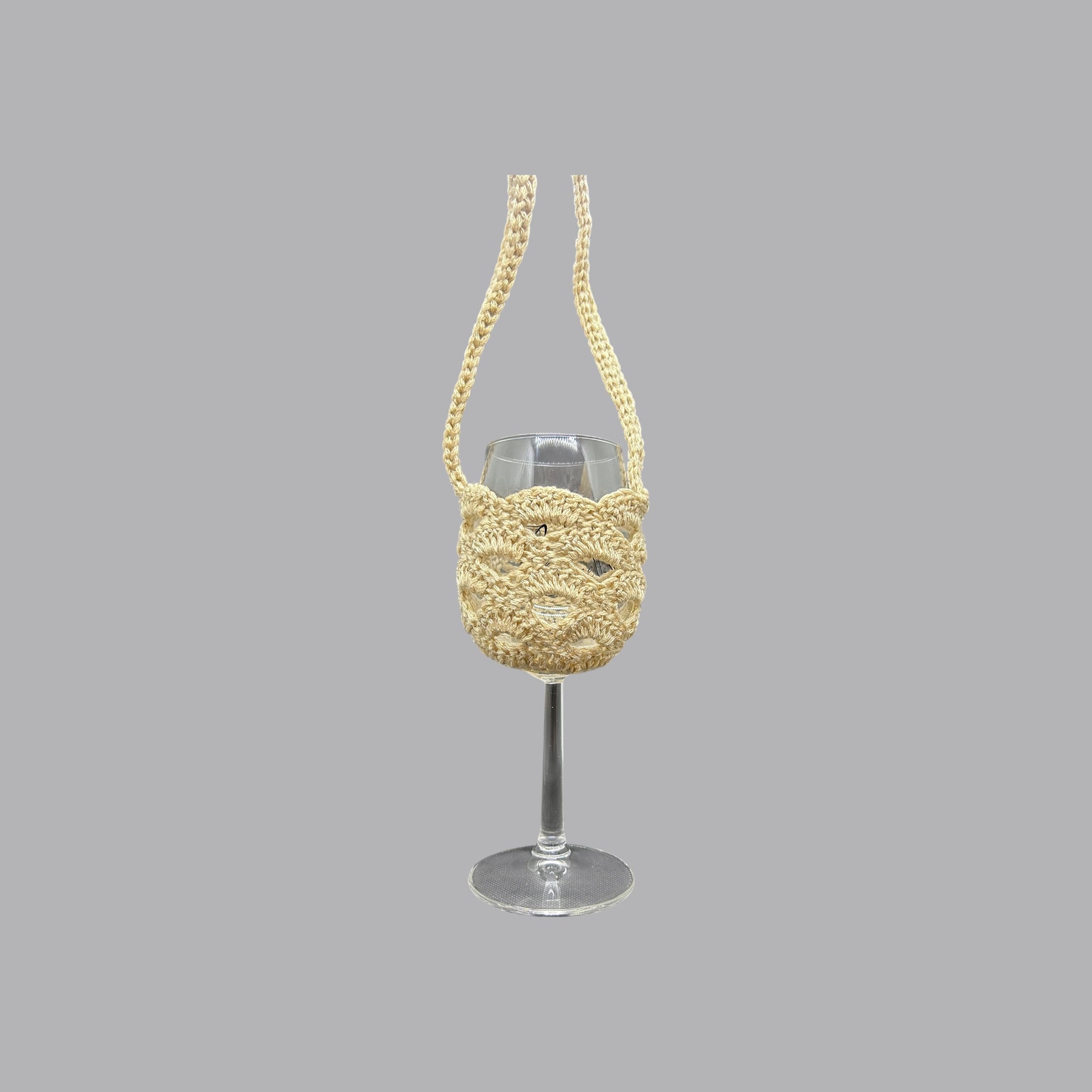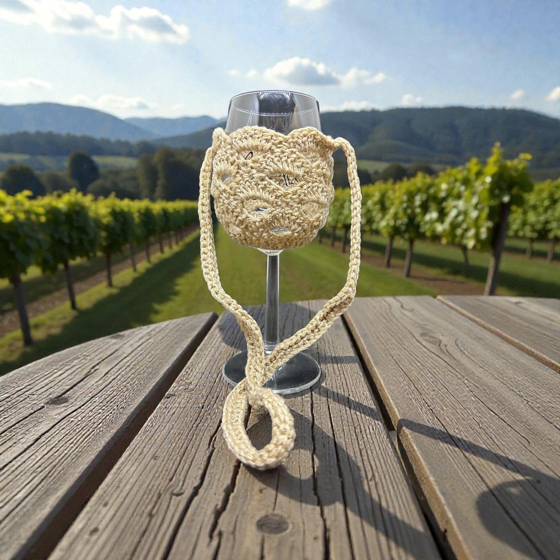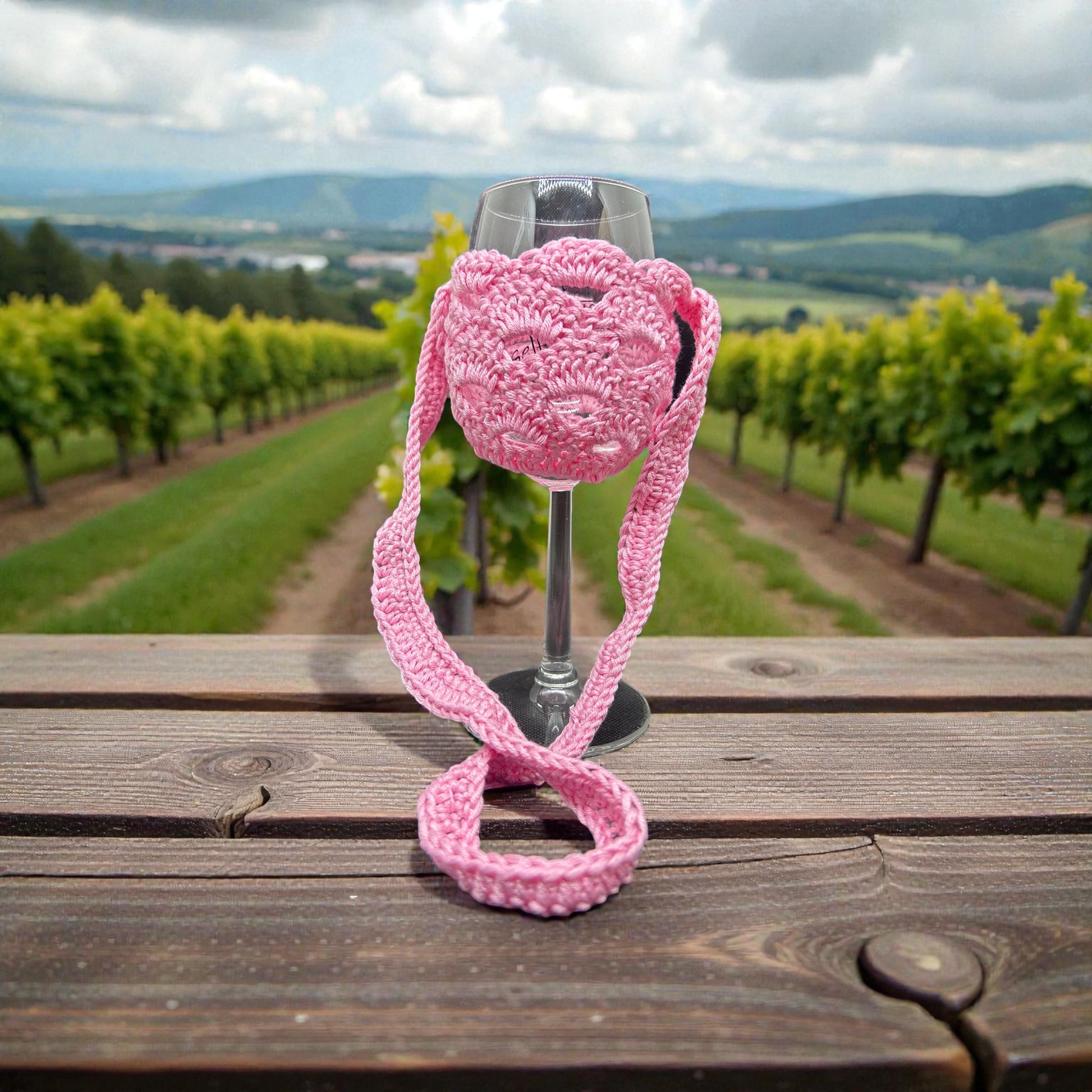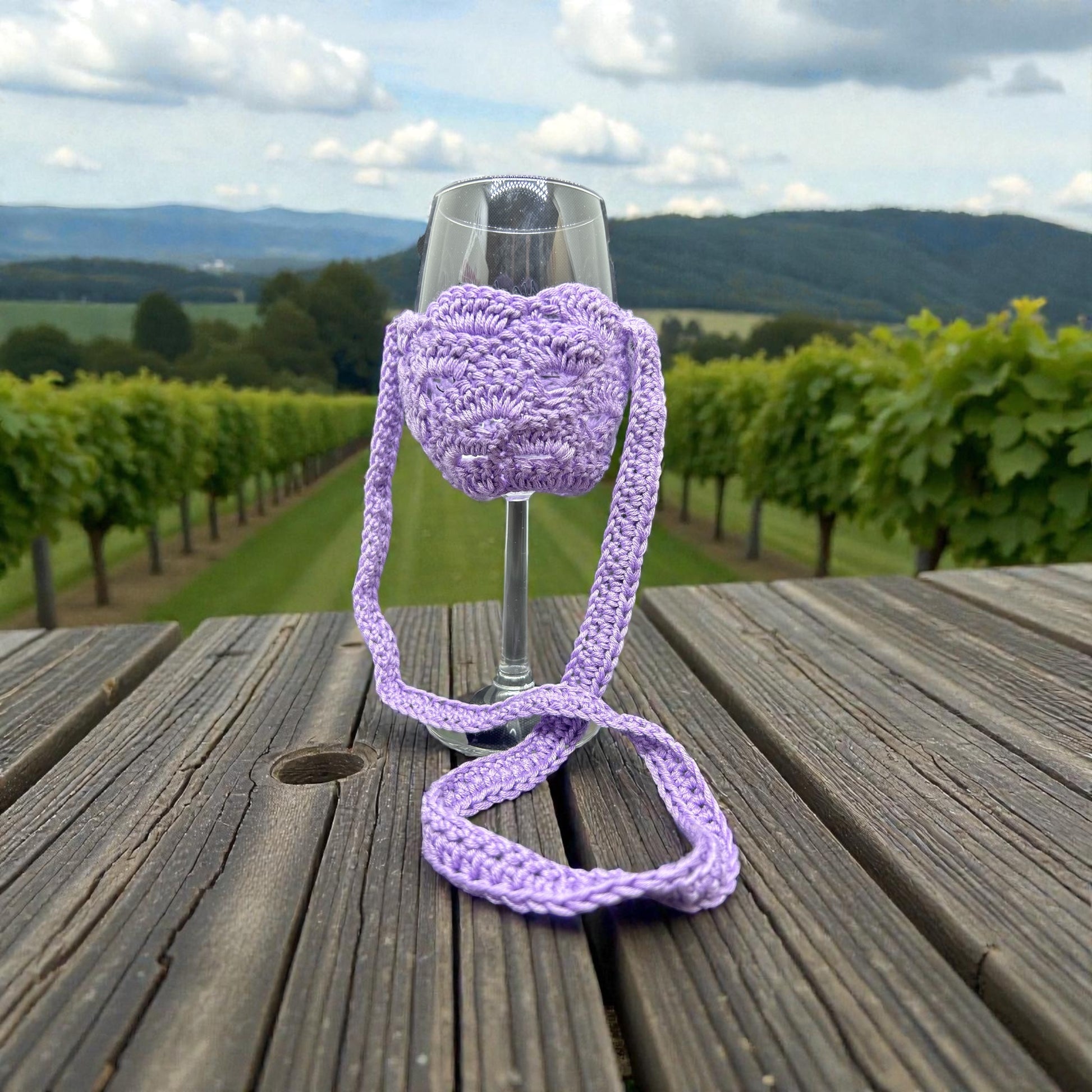 Unser liebevoll selbstgehäkelter Weinglashalter ist der ideale Begleiter für Weinwanderungen, Weinfeste, Gartenpartys oder gemütliche Abende im Freien.