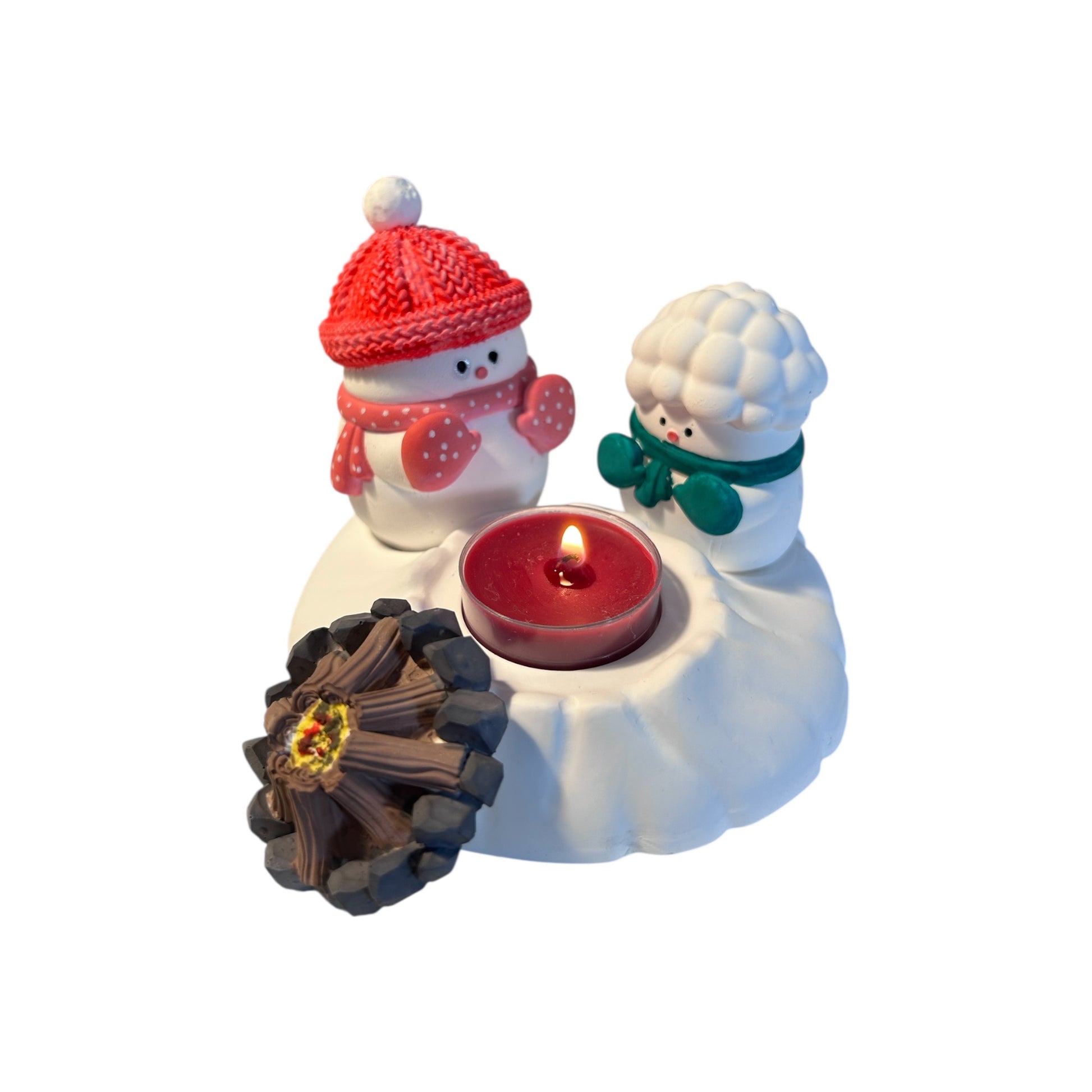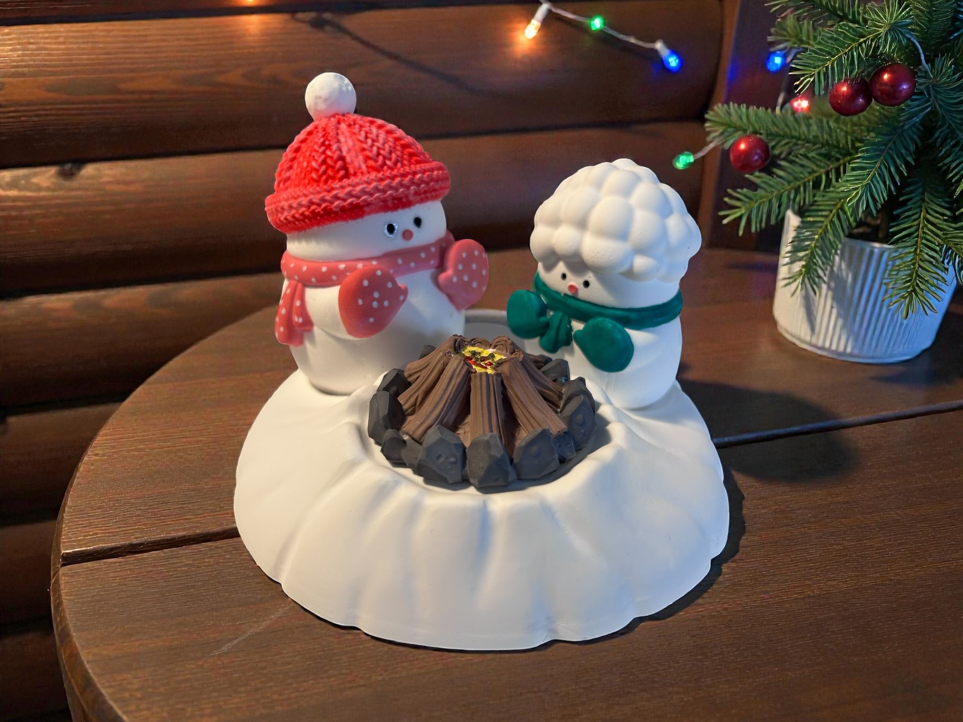 Das zentrale Lagerfeuer kann optional durch ein Teelicht ersetzt werden, um einen warmen, realen Lichteffekt zu erzeugen – ideal für gemütliche Abende oder als besonderes Geschenk. Die fein ausgearbeiteten Details wie Mütze, Schal, Holzstämme und Steinkranz sorgen für eine hochwertige, handgefertigte Optik.